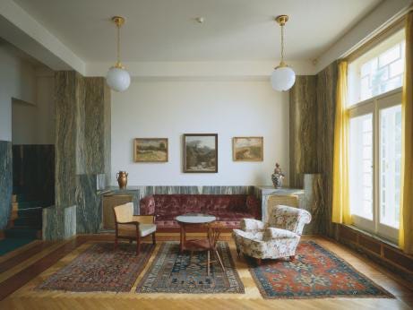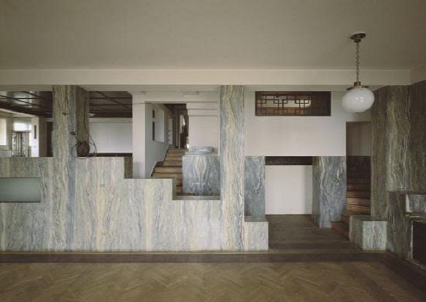The exterior of Villa Müller aligns perfectly with the previously discussed Loos paper, “Ornament and Crime.” The exterior of this work is largely a white, cubic facade. It was important to Loos that there be a clear division between the largely unadorned exterior, visible to the public, and the elegantly adorned private interior spaces. Especially elegant is the relatively rare Cipollino marble, bottom right below.