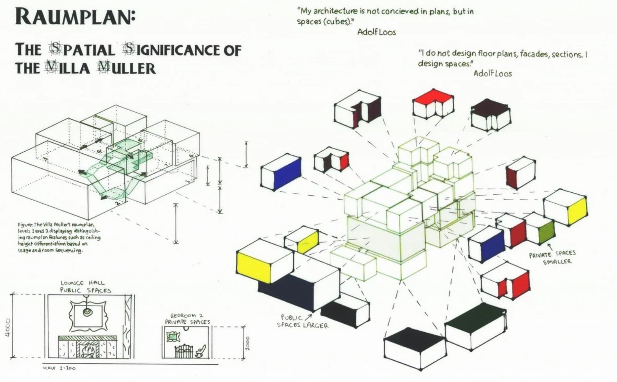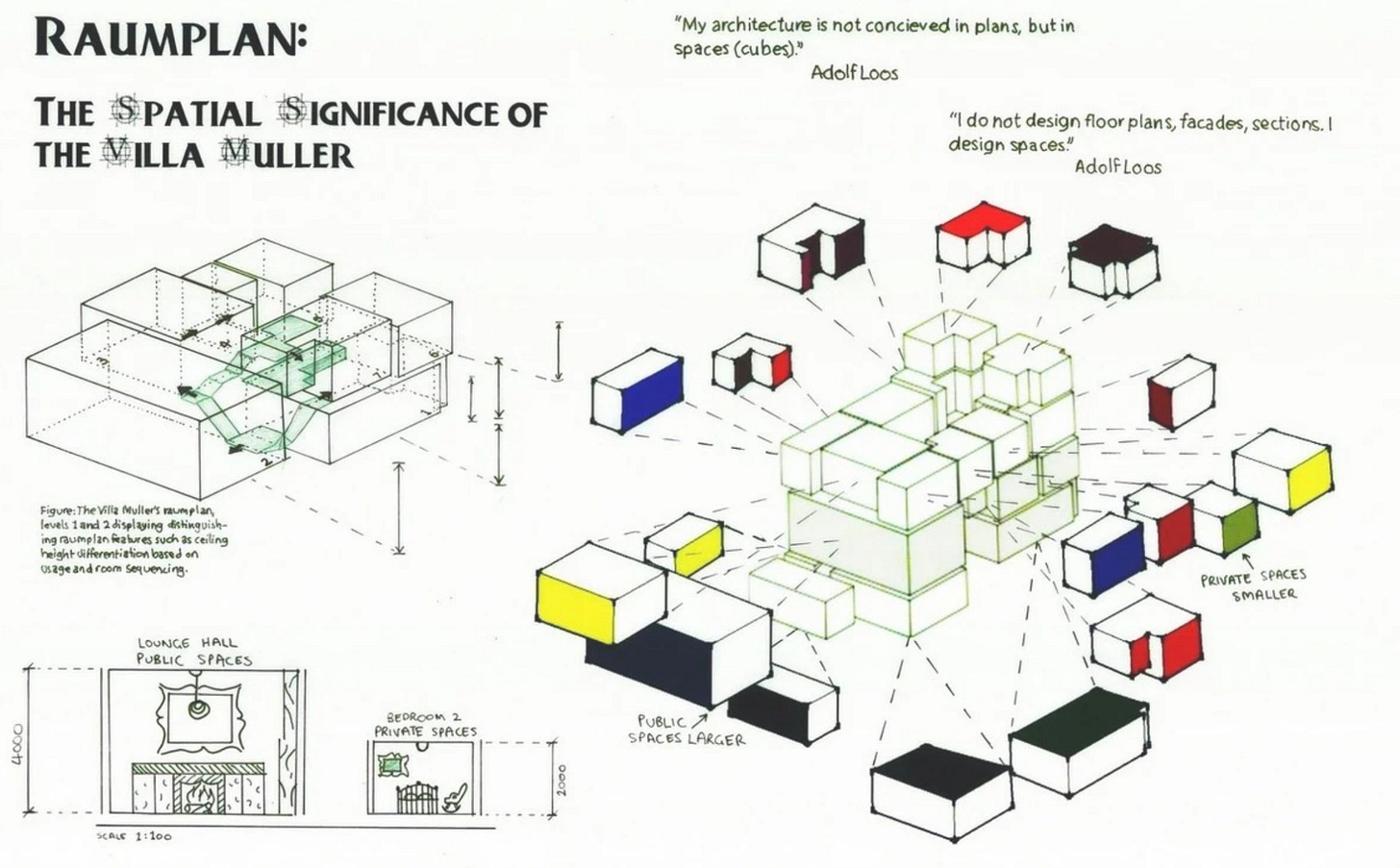 [It was a] concept introduced by architect Adolf Loos, refers to the design and organization of interior space based on the specific function of each room. Unlike the traditional approach of aligning rooms on a strict, regular floor plan, Raumplan suggests that spaces within a building should be differentiated in size, height, and character according to their intended use. This creates a more organic and dynamic layout, where rooms and levels interlock in a three-dimensional puzzle. It’s a design philosophy that prioritizes the practical and experiential aspects of architecture, demonstrating Loos’s focus on functionality and efficiency.