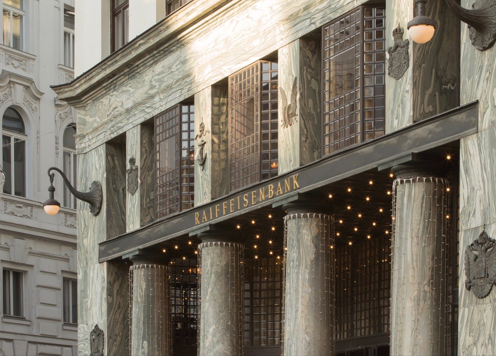 As might be expected, given the Loos philosophy, the exterior of this work is not of the riveting, eye-catching variety. But upon closer inspection, the solid Cipolino marble columns (below) add more than a touch of class to the pedestrian level.