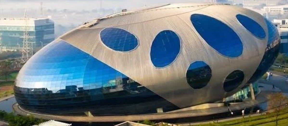 Designed by renowned Indian architect Hafeez Sorab Contractor for the Infosys Limited campus in Pune. The remarkably interesting website, www.re-thinkingthefuture.com, said this about the “Spaceship” building: